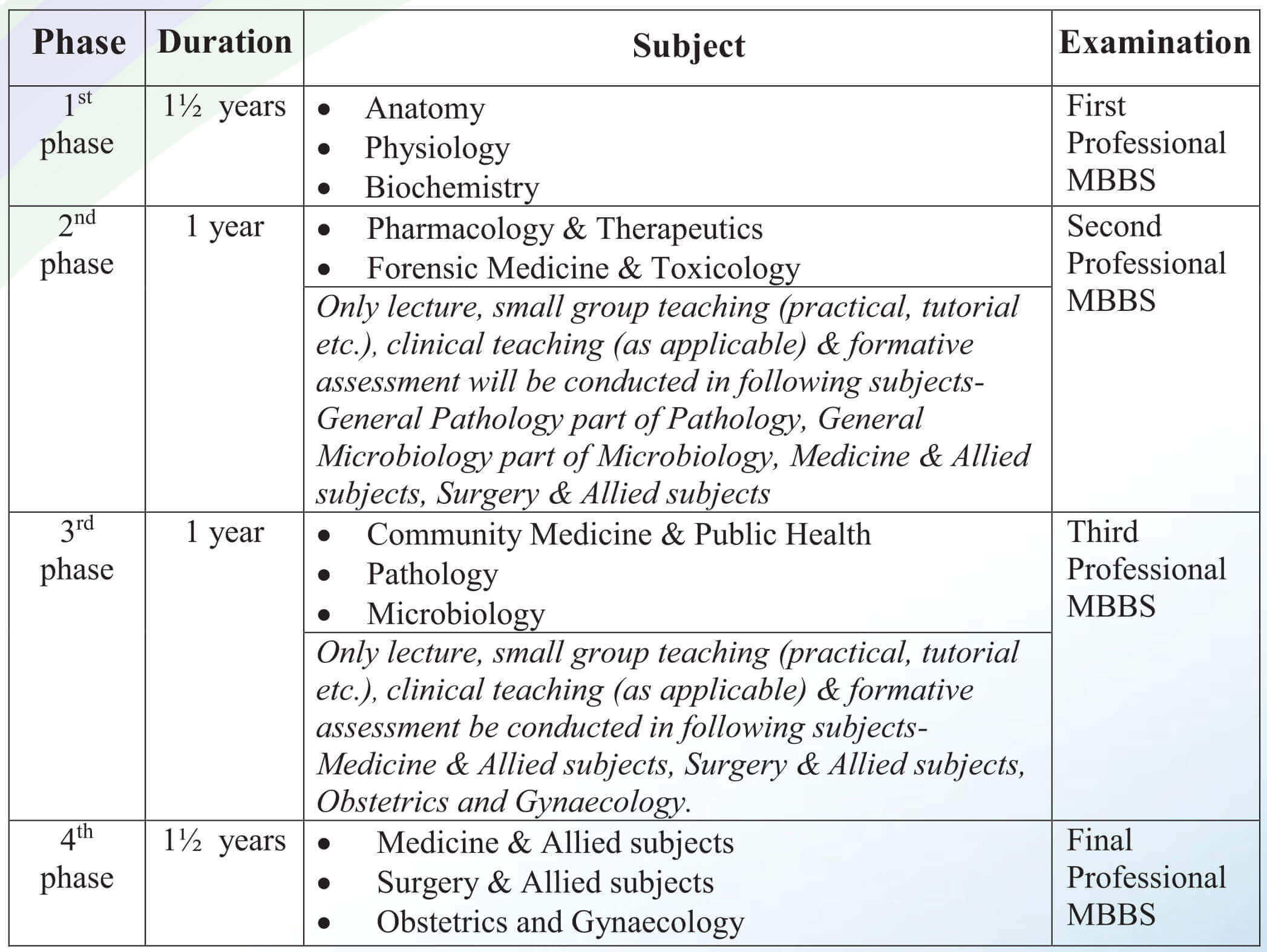 The MBBS course is divided into four phases.